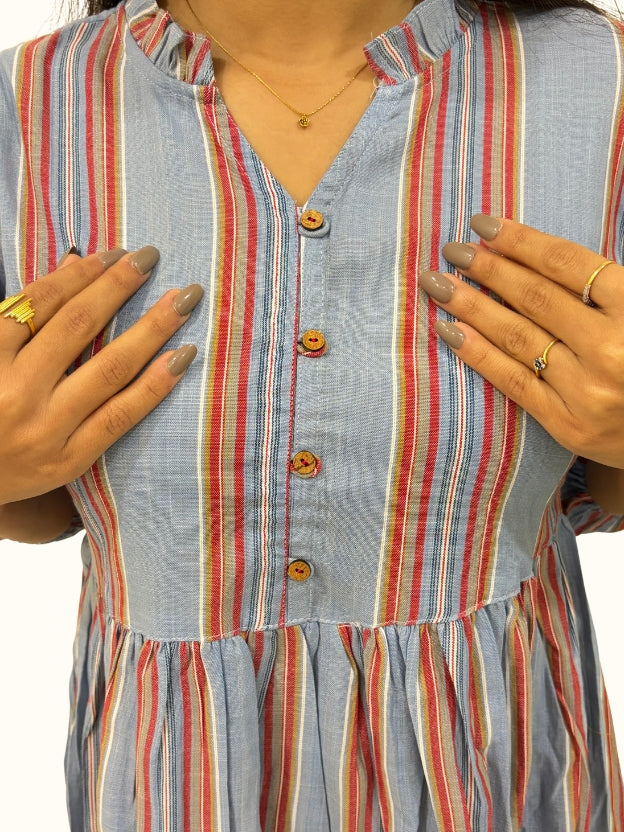 Design Details : Vertical stripes, soft waist gathers, ruffle neckline, flared hem
